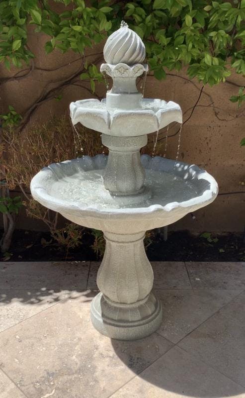Beautiful fountain, not fully assembled. It could be operator error, but I was unable to get a continuous flow of water and overfilled the basin to ensure the pump was primed enough to function. Aesthetically pleasing, but did not provide the desired effect.