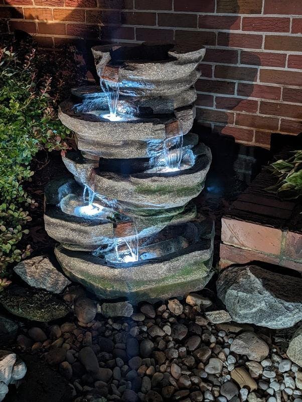 No Plumbing Required:This garden fountain plugs into any standard electrical outlet. It features 4 LED lights in the lower levels to illuminate the yard at night.