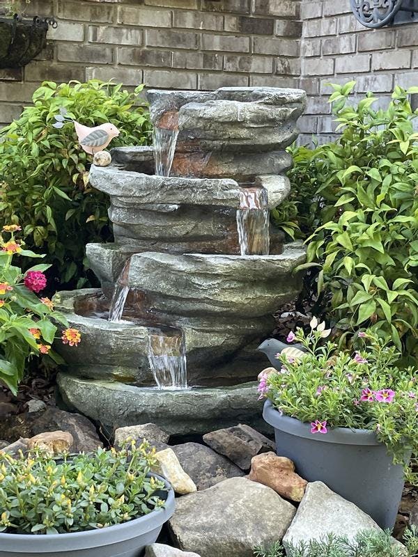 Soothing Water Sounds: This outdoor rock fountain cascades water down each tier, creating calming sounds. Once the water reaches the basin, the electric submersible pump circulates it back up to the top of the fountain.