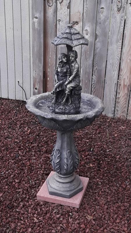 Charming, Romantic Design:A sculpture of two lovers under an umbrella adds a whimsical and heartfelt touch to gardens, patios, or walkways. The solar garden fountain measures 21" in diameter x 43" H, weighs 25 lbs, and has a 1.5-gallon water capacity.