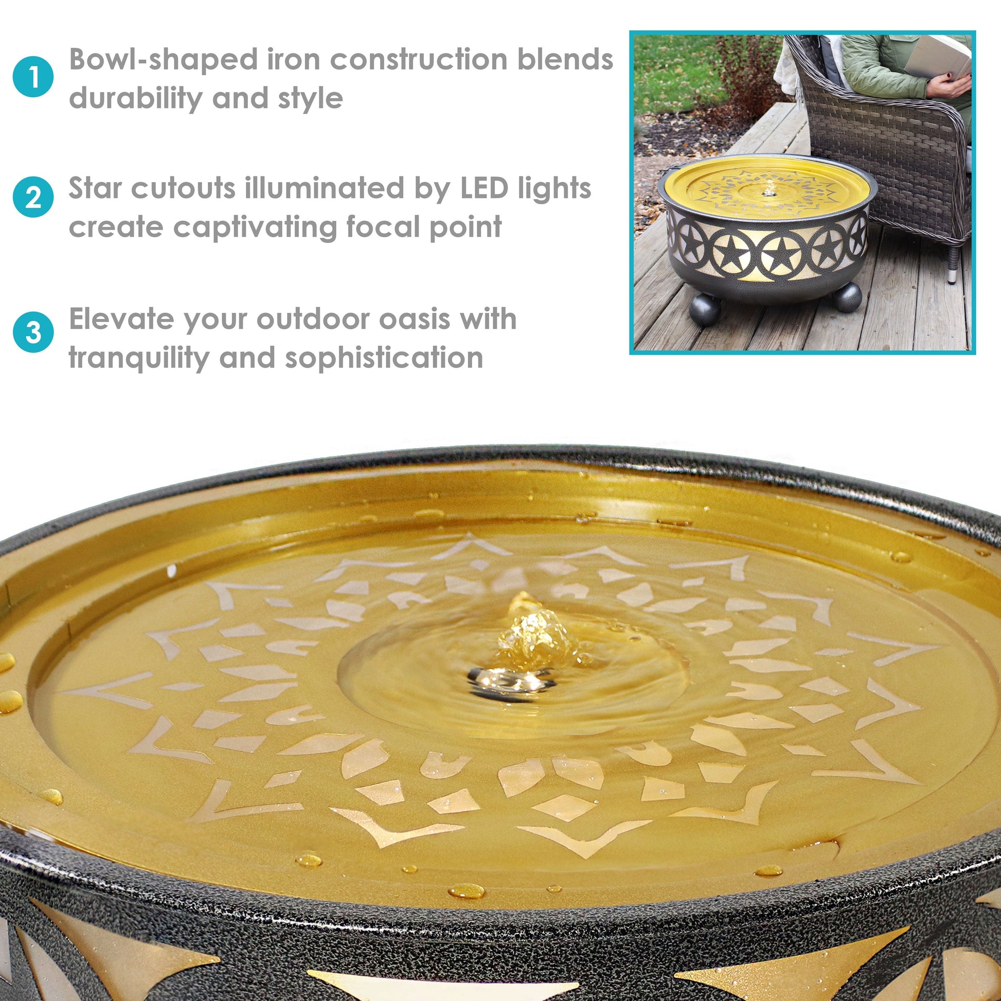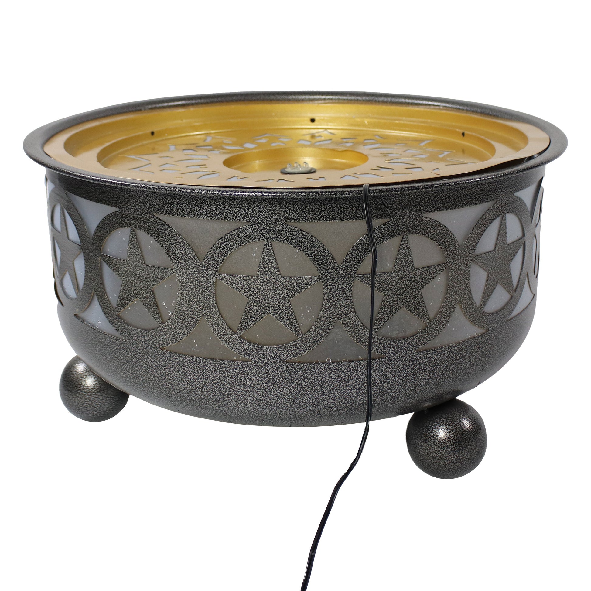 Create a unique and soothing centerpiece for your garden or backyard with this elegant all star bowl fountain. Featuring a beautiful repeating star pattern, this garden water fountain has a unique bowl design. The soft trickle of running water is sure to soothe away your worries and cares. Plus, this fountain features an interior LED light so you can enjoy this fountain's beauty even after the sun sets. Simply plug the fountain into a standard electrical outlet. The included electric submersible pump will circulate the water through the fountain with no plumbing or complex installation required.