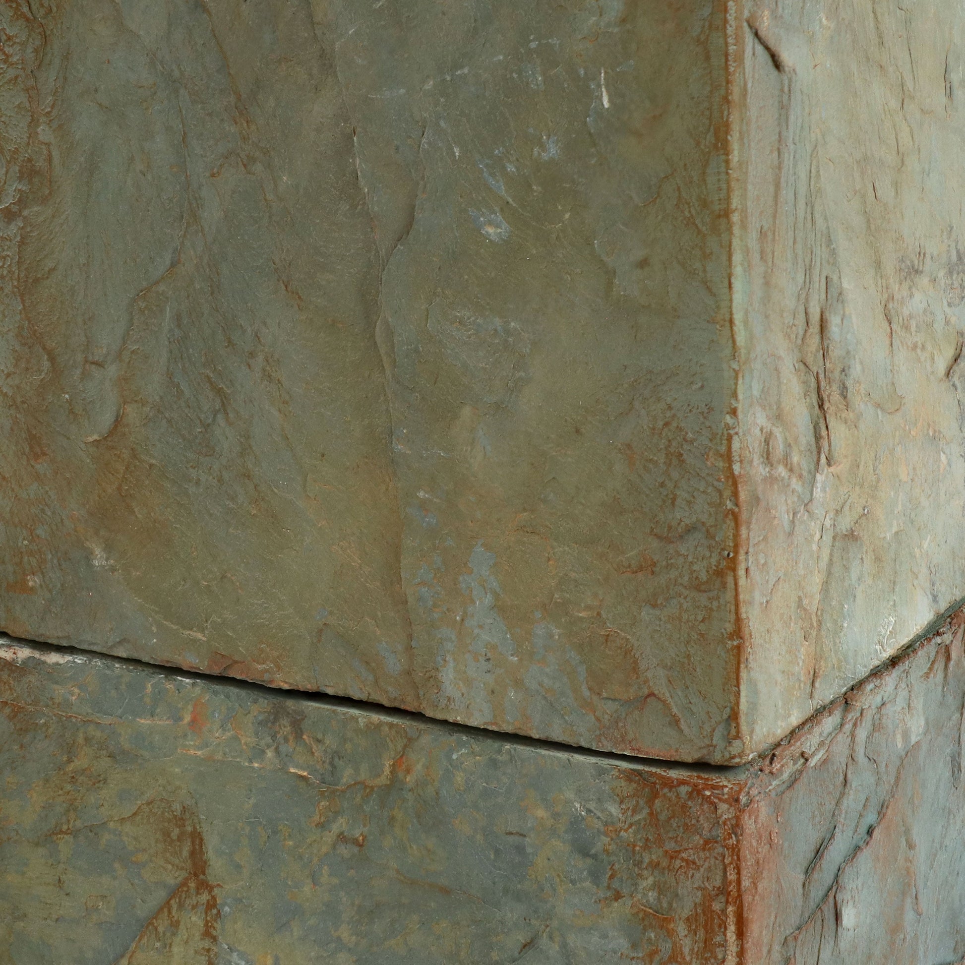 This stylish outdoor water fountain features a copper-colored stainless steel orb topping a resin bowl on a rustic green patina slate pedestal base, adding elegance to any garden or patio. Crafted for natural tranquility, the gentle water flow creates a serene atmosphere, perfect for unwinding outdoors. Decorative pebbles enhance the aesthetic appeal, and its durable, weather-resistant construction ensures long-lasting beauty. Ideal as a focal point in a garden or among foliage, this slate water fountain brings sophistication and serenity, inviting relaxation with soothing water sounds.